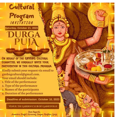 1350 NW 75th St. | October 21, 2023. The major festival of the Bengalis is Durga Puja. All members of this community awaits the entire year for this special day. It is one of the prime goals of the community at Gainesville to capture the essence of this festival in this Florida area. We have been celebrating this puja with all its vigor every year.